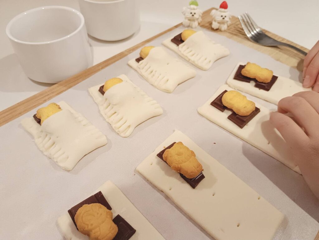 チョコレートを小さな「枕」に見立て、その上にクッキーたちをそっと寝かせます。