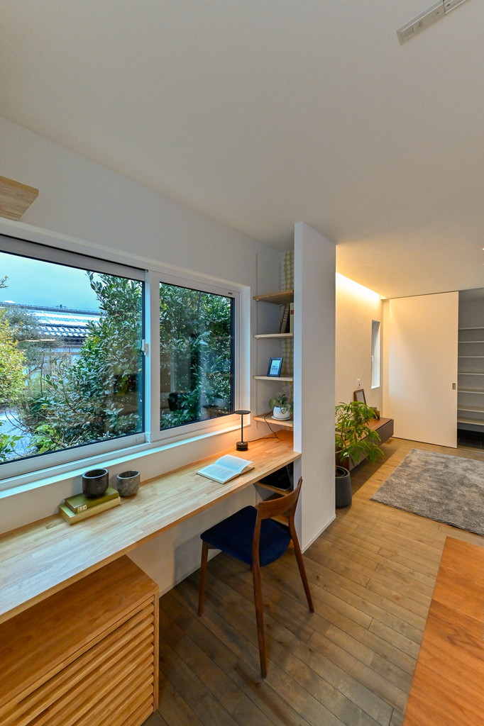家族の生活動線から少し離れた、静かな場所に独立した個室書斎を設けることで、高い集中力を維持できる環境が手に入ります。