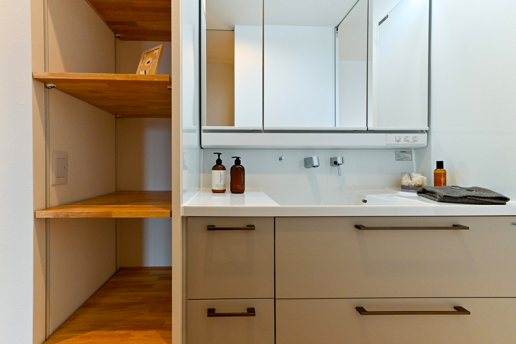 旧玄関の踏み板は洗面の可動棚として再生しました。